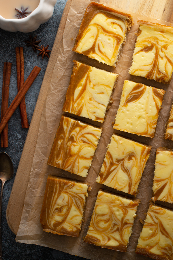 Believe it or not, we make this pumpkin cheesecake with a box of German chocolate cake mix! It’s completely unexpected and gives a great chocolate flavor. It mixes well without overpowering the flavor of the pumpkin and spice. It’s like a pumpkin spiced latte, only better!